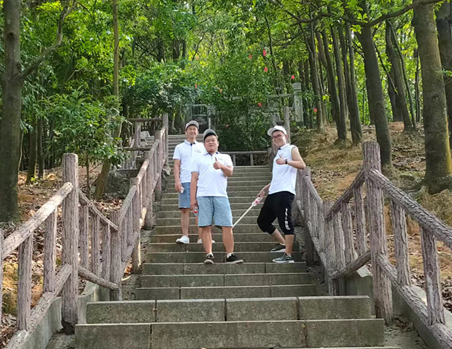 山路前半段稍緩和,大家還能大隊結(jié)伴而行,甚至走在隊伍最前方的帶隊同事還能高舉旗幟快速奔跑,但在行進至快半山腰后,坡度陡峭的石階路開始出現(xiàn),上山路途難度加大,隊伍逐漸形成了梯隊。體力好、耐力強的同事依然穩(wěn)步快速向上,體力稍遜的同事雖然與前面的同志拉開了距離,但也絲毫不甘落后,勇往直前,奮起直追。盡管山路漸陡、腳步變得沉重,呼吸變得急促,但是,大家互相關(guān)照,相互勉勵,共同堅持,最終成功登頂。
